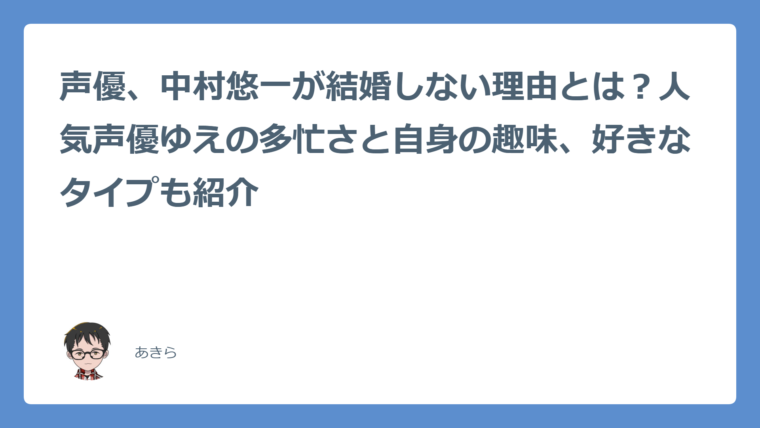 この記事では、声優の中村悠一が結婚しない4つの理由と、好きなタイプについて現在判明している情報を元に解説します。