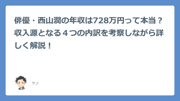 俳優として着実にキャリアを重ね、2025年で芸歴20年を迎える西山潤さん。子役時代から多くの作品に出演し、いまや実力派俳優として注目を集めています。そんな西山潤さんの「年収はどのくらいなの?」と気になる方も多いのではないでしょうか。