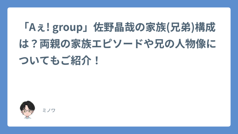 みなさんは佐野晶哉さんをご存知でしょうか?アイドルグループ『Aぇ! Group』のメンバーであり、関西ジャニーズjr.でNO.1の歌唱力を持つとされる人物です。そんな佐野晶哉さんの家族構成について知りたい方も多いのではないでしょうか?そこで今回は、以下の内容についてお届けします。
