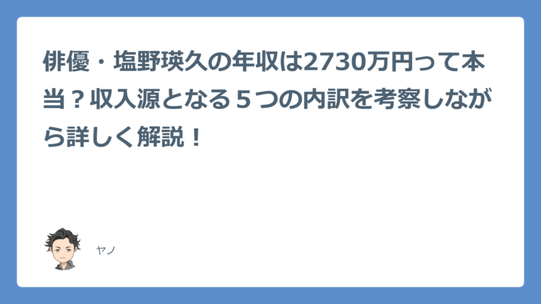 若手俳優・塩野瑛久さんの2024年の年収、気になりませんか?ドラマや映画の出演はもちろん、CMや舞台、TV番組、さらにはWEB連載までこなすマルチな活躍ぶり。実は、これらの活動を合算すると年収はなんと2730万円と推定することができました。